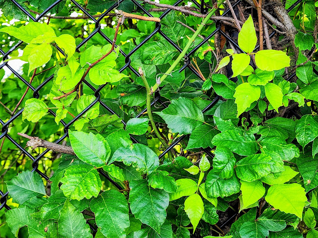 It was 84°f with a light breeze rustling leaved branches and gracing sun kissed faces. Ample sunshine warmed my back as I walked toward the tree lined trail. Virginia Creeper and Poison Ivy were entwined along the linked fence that surrounds the pond and there was a lovely fragrance permeating the air from Common Milkweed that gives off the scent of lilacs when the sun lights upon them.